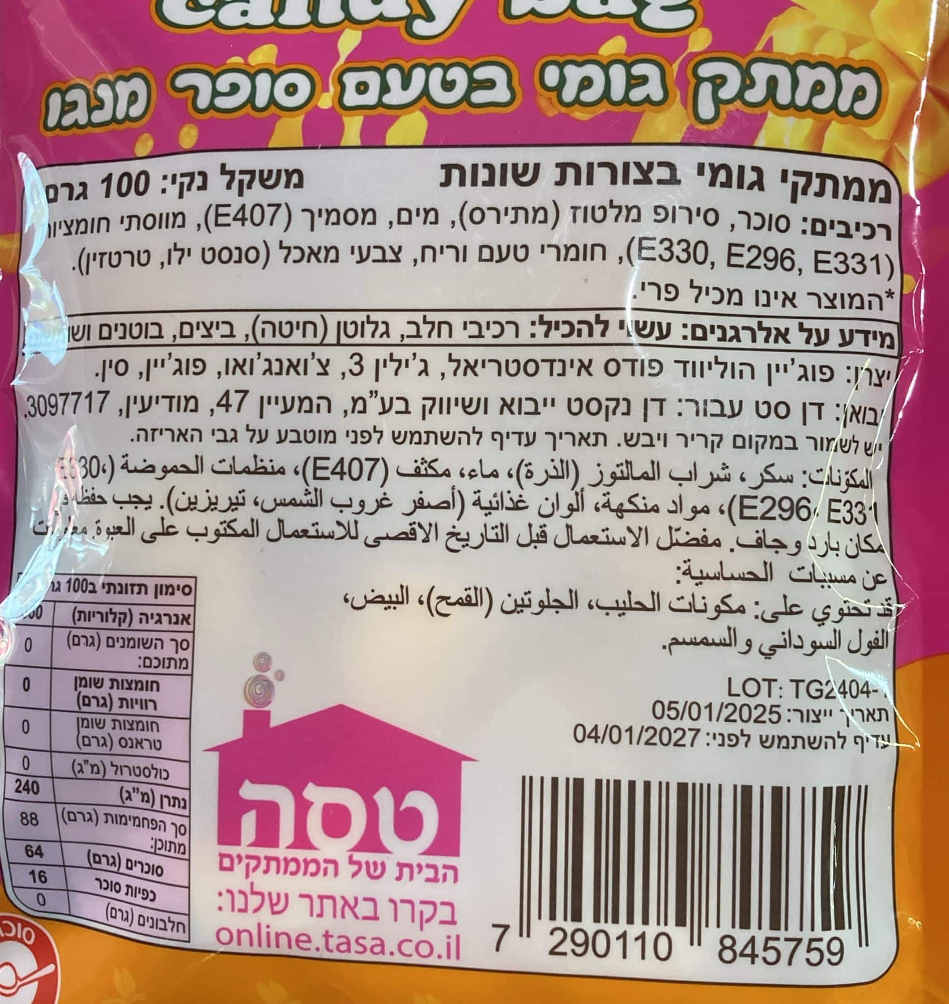 SC Renew MembershipSC Join Membershipממתק אצבעוני 7.5 גרםגומי המבורגר גדול+ ג'ל חמוץ 50 גרםגומי המבורגר מיני 10 גרםגומי ואוו בקבוק מסטיק חמוץ 500 גרםגומי ואוו מיני המבורגר 500 גרםגומי ואוו נחש פירות חמוץ 500 גרםגומי ואוו תות שדה קטן חמוץ 500 גרםגומי ואוו כריש אבטיח חמוץ 500 גרםגומי ואוו תות אוכמניות 500 גרםגומי ואוו נחש אנקונדה 500 גרםגומי ואוו כובע טרופי חמוץ 500 גרםראש ג'לי אבטיח 8 גרםסוכ' מנטוס רול יחידה דיסקברי 37.5 גרםאורביט גומי לעיסה ללא סוכר בטעם תפוח 14 גרםראש ג'לי תות 8 גרםראש ג'לי פטל 8 גרםראש ג'לי דובדבן 8 גרםעוגיות טעם חמאה קופסת פח ורדים 114 גרםעוגיות טעם חמאה קופסת פח פרחים 114 גרםרול וופל מאסטר 400 גרםוופל מאסטר גריף 360 גרםגולון מגה שוקו 145ג'מילקה טבלה פטל 100ג'-Kמילקה טבלה אוראו סנדוויץ' 92ג' - Kמילקה טבלה אגוז שלם 95ג'-Kמילקה קייק אנד שוק 175ג'-Kמילקה טבלה צימוק אגוז 90ג'-Kמילקה טבלה דובדבן 100ג' - Kקונוס לבבות שוקולד באהבה 48 גרםלבבות שוקולד בקופסא יהלום 52גרלקקן שוקולד 25 גרם I LOVE YOUסוכריות בטעם קוקוס 250 גרםסוכריות ג'ינגר קוקוס 250 גרםצ'יפס ירקות שורש בטטה 40ג אורגניצ'יפס ירקות שורש סלק 40ג' -אורגניהל משקה אנרגיה קלאסי 250 מלאמ אנד אמס שוקו חום 200ג'- Kסוכריות ג'ילי בוני פרוט 200 גרם SUMMER MIXסוכריות ג'ילי בוני פרוט 200 גרם CITRUS MIXסוכריות ג'ילי בוני פרוט 200 גרם BERRY MIXפופקורן בטעם שוקו 60 גרם OISHIפופקורן בטעם קרמל 60 גרם OISHIפופפולי פופקורן מוכן מלח ים 127 גרםפופפולי פופקורן מוכן פלפל מלח ים 142 גרםפופפולי פופקורן מוכן קרמל 142 גרםפופפולי פופקורן מוכן גבינה נאצו 142 גרםפופפולי פופקורן מוכן צדר לבן 142 גרםפופפולי פופקורן מוכן מתוק מלוח 142 גרםפופפולי פופקורן מוכן צדר חלפיניו 142 גרםפופפולי פופקורן מוכן מרשמלו 142 גרםפופפולי פופקורן מוכן חמאה 142 גרםקינדר בואנו דארק בודד 43 גרםגונץ בוטנים קלויים עם מלח 150 גר'מנטוס שקית מנטה 135 גרםמנטוס שקית פירות 135 גרםמארז מקלות ביסקוויט עם שוקולד חלבי 150 גרםזריפה גרעיני דלעת 250 גרםזריפה גרעיני אבטיח 200 גרםקרפט רוטב ברביקיו אורגינל 510 מ"לפבורס טראפל לבן פיסטוק 100ג'פבורס טראפל שוקו 100ג'פבורס טראפל לבן וניל 100ג'פבורס טראפל בלגי 400ג'אנרג'י מאגדת דגנים טראפלס ושוקולדאנרג'י מאגדת תחתית מרירנסקוויק אבקת תות 350ג'גולון טוסטדה ללא ת.סוכר 175ג'גולון טוסטדה ללא סוכר 350ג'גולון אורגני ביו שוקוצ'יפס 150ג'גולון אורגני ביו דיאג'סטיב צ'יה 270ג'גולון אורגני ביו דיאג'סטיב ש.שועל פירות 270ג'גולון אורגני ביו דיאג'סטיב ש.שועל שוקו 270ג'גולון אורגני ביו ביסקוויט 170ג'גולון מגה סנדוויץ' 250ג'גולון אורגני ביו מריה 350ג'סוכ' צ'ופה צ'ופס דברים מוזרים 120ג'סוכ' צ'ופה צ'ופס דברים מוזרים 120ג'צ'ופה צופס סוכ על מקל חמוץ 120ג'ברילה פסטו ריקוטה א.מלך 190ג'תחתית לפאי גראהם קרקר 170ג'גומי וידאל תות סוכר 500 גר'ברילה פסטו בזיליקום לימון 190ג'ברילה פסטו בזיליקום מוצרלה 190ג'סאנטאנג'לו-פאנטונה שוקולד צ'יפס 500 גרםסאנטאנג'לו-פאנטונה בקופסה 500 גר'דיי ביסתן קלינדר בטעמים שונים 251 גרםטבלת מילקה טופי אגוזים 300ג' Kטבלת מילקה טריולד 280ג' Kשוק' מילקה אוראו 300גר' Kטבלת מילקה שוקו אנד קקס 300ג' Kגומי תנתה 500 גרם מיקס מסוכר מיני תות בננהגומי תנתה 500 גר' תות חמוץ גדולגומי תנתה 500 גר' נשיקהסוכריות ג'לי עטופות שמחותראש משוגע תות 40 גרםלקקני מיני מארז כ 18 יח' צבעי הקשת 60 גרםפרינגלס פלפל הבאנרס 158 גרםשוק' בר טובלרון חלב 200ג'דג כסף פרווה 1 ק"גדג זהב חלבי- 1 ק"גcremo וופל קרם שוקולד מריר בודדאורז לבן דביק 1 ק"גאצות נורי סילוור 10 דפים 25 גרםאבקה להכנת סחלב 500 גרםנסטלה קורנפלקס ללא גלוטן 375ג'אנטון ברג מרציפן מילוי בייליס 175 גרםאנטון ברג מרציפן משמש בברנדי 220 גרםשוקולד רושן אורירי מריר 80 גרםשוקולד רושן אורירי חלב 80 גרםשוקולד רושן אורירי לבן קרמל 80 גרםעוגיות מילקה ביסקוויט שוקולד חלב 150 גרםמארז סוכריות לעיסה תות שדה ודומדמניות 150 גרםהיידי מוצארט נוגט 119ג'טוניס שוקולד חלב עם עוגיות שוקולד צ'יפס 180 גרםטוניס שוקולד מריר מעולה 